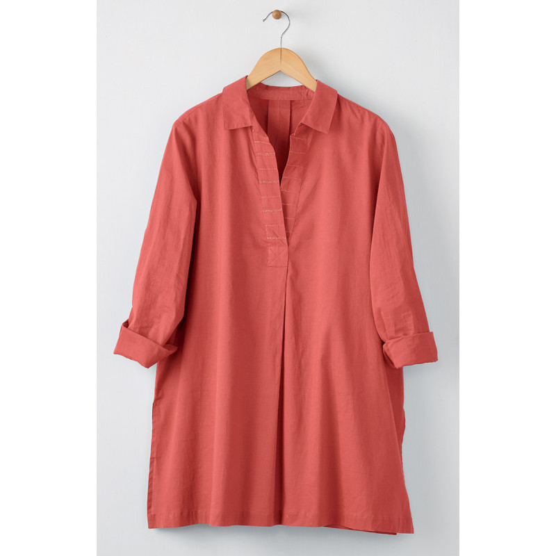 A style that works without even trying. Soft eco-friendly organic cotton shirt in Natural Dye brick red. Tone-on-tone hand embroidery accents V-neck, center pleats front and back. Deep side slits give an easy sweep. Long sleeves with button cuffs.