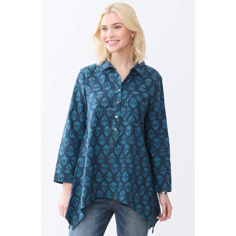 A-line shirt-collar lightweight cotton tunic with a five-button placket is handprinted in bright blue batik blockprints on dark grey. The handkerchief hem gives a graceful sweep. Hand embroidery accents.