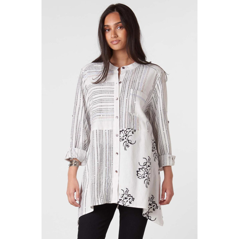 This A-line shirt of softly-ribbed textured cotton features two black block prints. Hand embroidery follows the patterns of handprinted dashes. Stand collar and button front, back yoke with pleat. Handkerchief hem gives a gentle sweep. Long sleeves to wear two ways - button the cuffs or roll up with the roll-tabs.