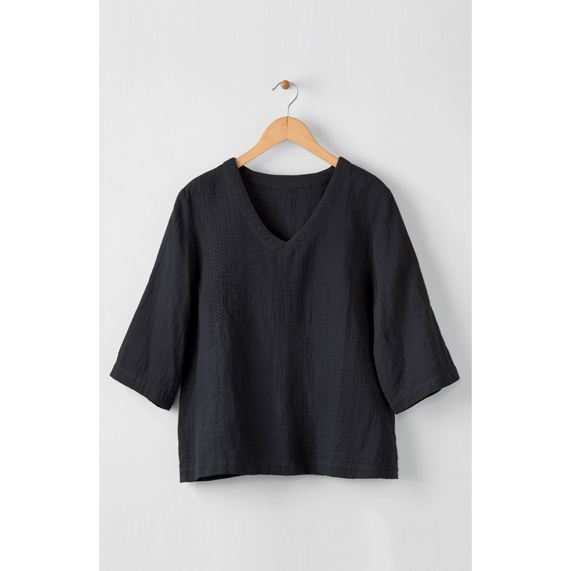 Soft and drapey, this double gauze top with a V-neck will become your new favorite. Tone-on-tone embroidery accents the shoulder.