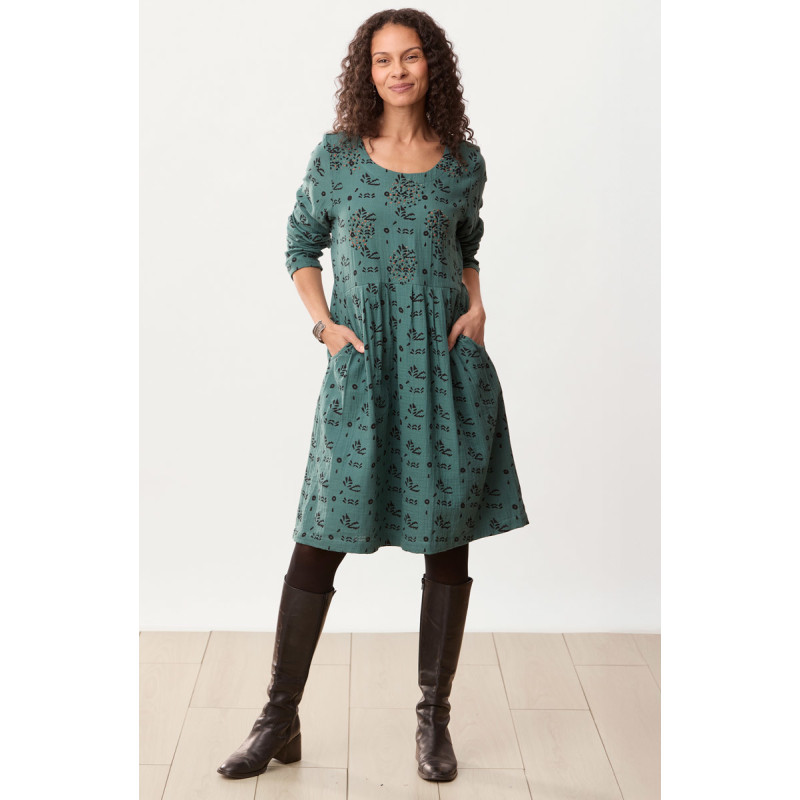 Soft and comfy, this dusty blue-green double gauze dress blockprinted in black has a softly gathered pleated waist and full skirt. Short back ties can adjust the fit. Hand embroidery highlights on bodice.
