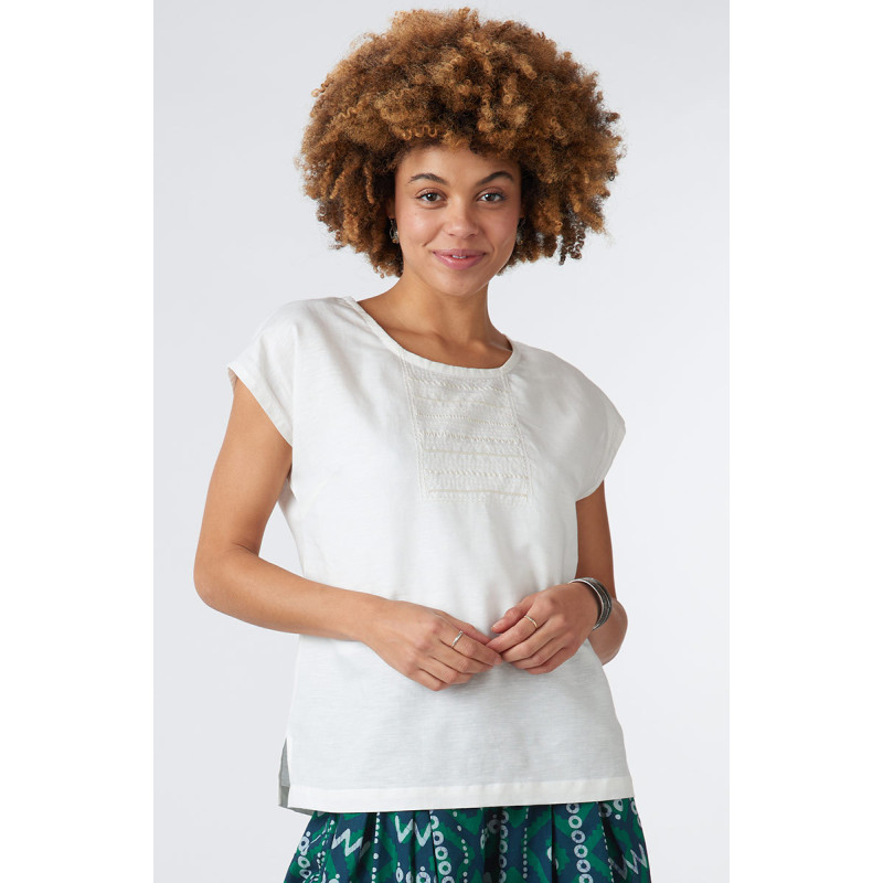 The refined alternative to a tee: our woven cotton/linen blend cap-sleeve top. Tonal hand embroidery creates a faux-yoke. Side slits. Fits true to size.